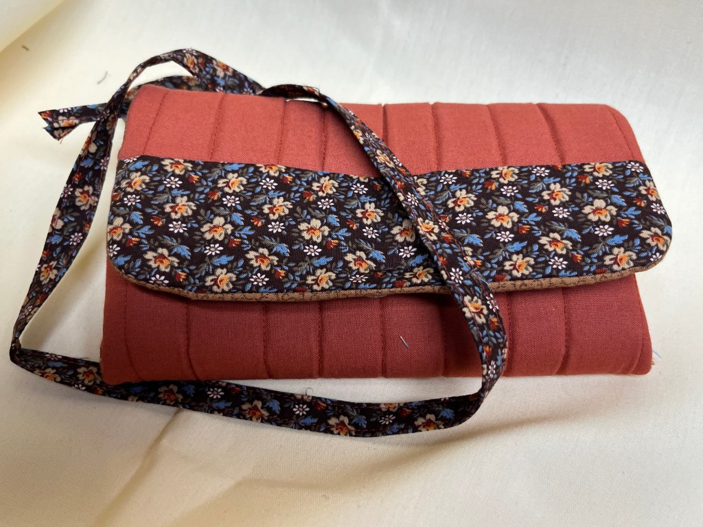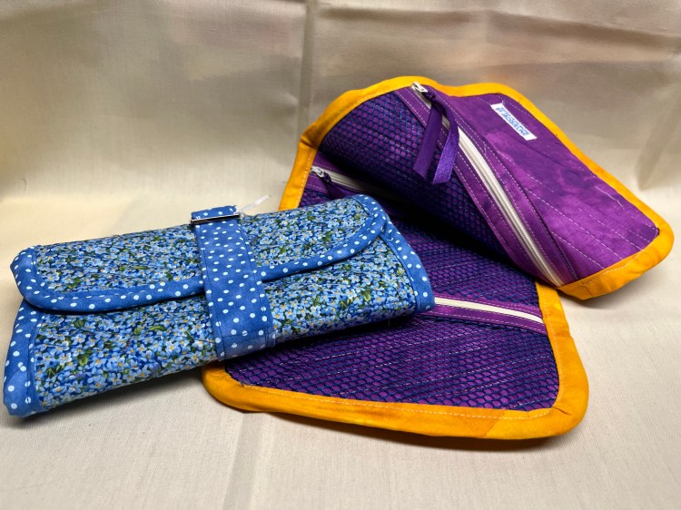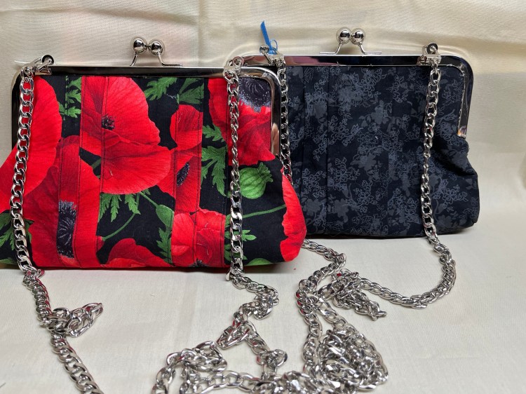 Breckland Bag – Style of the 1940s. Wool with one large outside pocket and double inside pocket. Height 9 ½”; Width at widest point 14″; Base width 1 ¾”Buffalo Plaid – fleece with multiple pockets inside. Snap or zipper closure. (approximately 16 ½” wide at the top x 12″ tall x 4″deep) Sizes vary.* NOTE: This is the only tote fabric I make more than once!Mini Frame Wallet – 3 card pockets, 2 open pockets, interior and exterior zippered pockets. (4 ½” wide)Santorini Handbag – Zipper enclosure. Two outside pockets and multiple inside pockets. (15″ wide at the top x 10″ tall x 4″ deep)Switchback Convertible Backpack/Shoulder Bag– wear cross-body, over the shoulder, or as a backpack. Plenty of pockets. Recessed zipper at top. (11″H x 11″W x3 ½” D at top to 4 ½” at bottom)CUSTOM ORDERS ONLYCapri Carryall – Six pockets inside with zipper or magnetic closure. (11″W at top X 12 1/2″ T X 4’D)Uptown Tote – Sturdy construction and fully lined. Inside: zippered pocket and 4 deep slip pockets. 1″ shoulder straps, magnetic closure. (16″ top width x 11″ height x 4″ depth and 12″ bottom)Daybreak Cork Wallet –All cork wallet with zippered opening, Front flap with 8 card pockets, Back pocket large enough for cell phone. (5″H x 8″W)Night and Day Reversible Mini Tote – Features handles with a tie enclosure. Reversible with a quilted side and a non-quilted side with a welt pocket. (9″H x 11″-16″W x 6″D)Olive Handbag – A cork bag with a double zipper opening with flap enclosure. Outside and inside zippered pockets. Single removable handle. (10″W x 7″H x 3″D)Cabana Mesh Tote – Mesh bag with two outside pockets. (17″W x 15″H x 4″D)Saxted Green Satchel – wool 1940’s evacuee military-style satchel with one outside pocket and large inside pocket. Magnetic closure. (13″ H x 16″ W)Stella Sling Bag – This cork bag has 1 outside zip pocket, a recessed zip closure and a decorative yet functional flap closure. (9″ W bottom, 14″ W top: 11″ tall x 6″ deep)